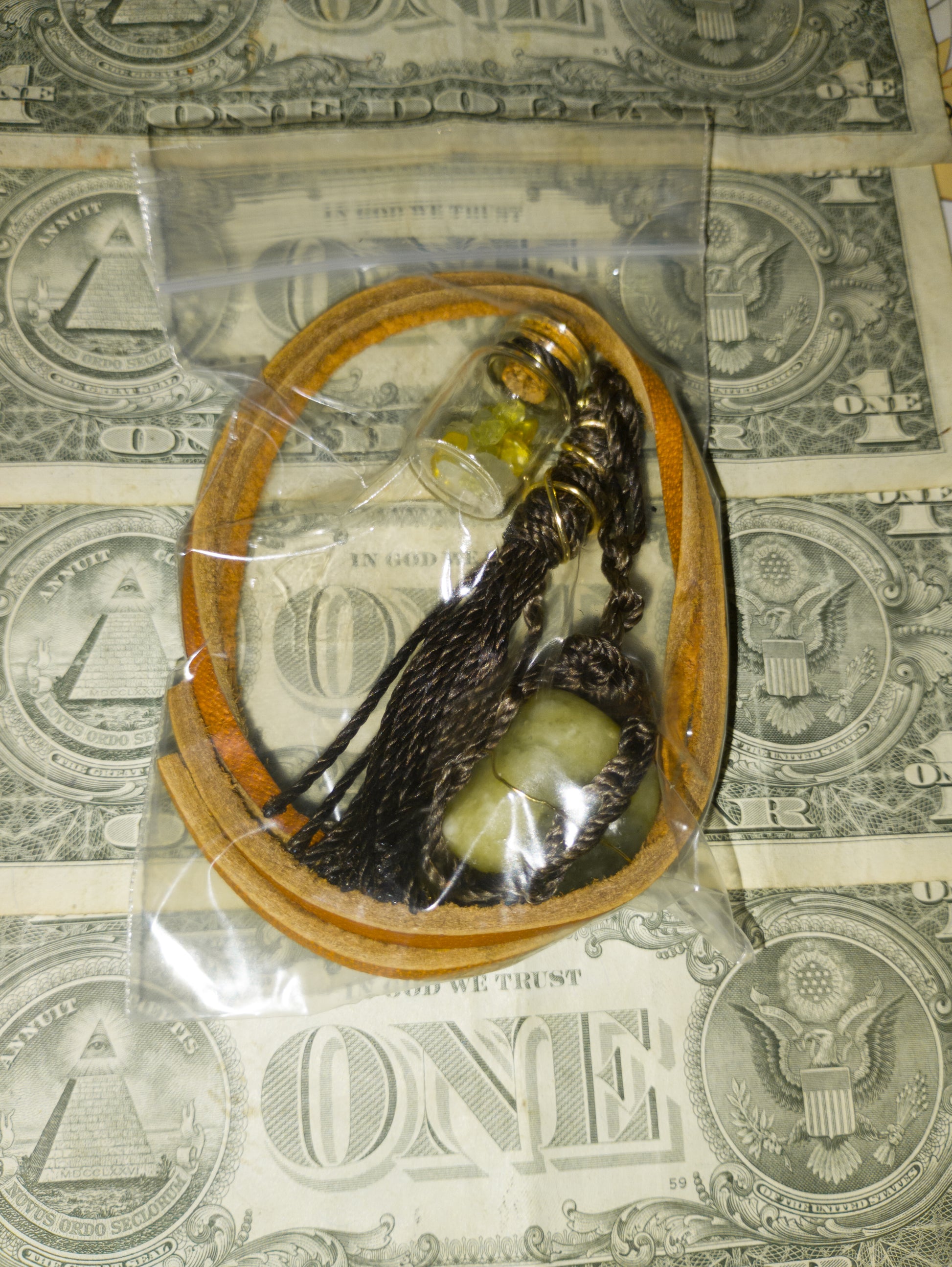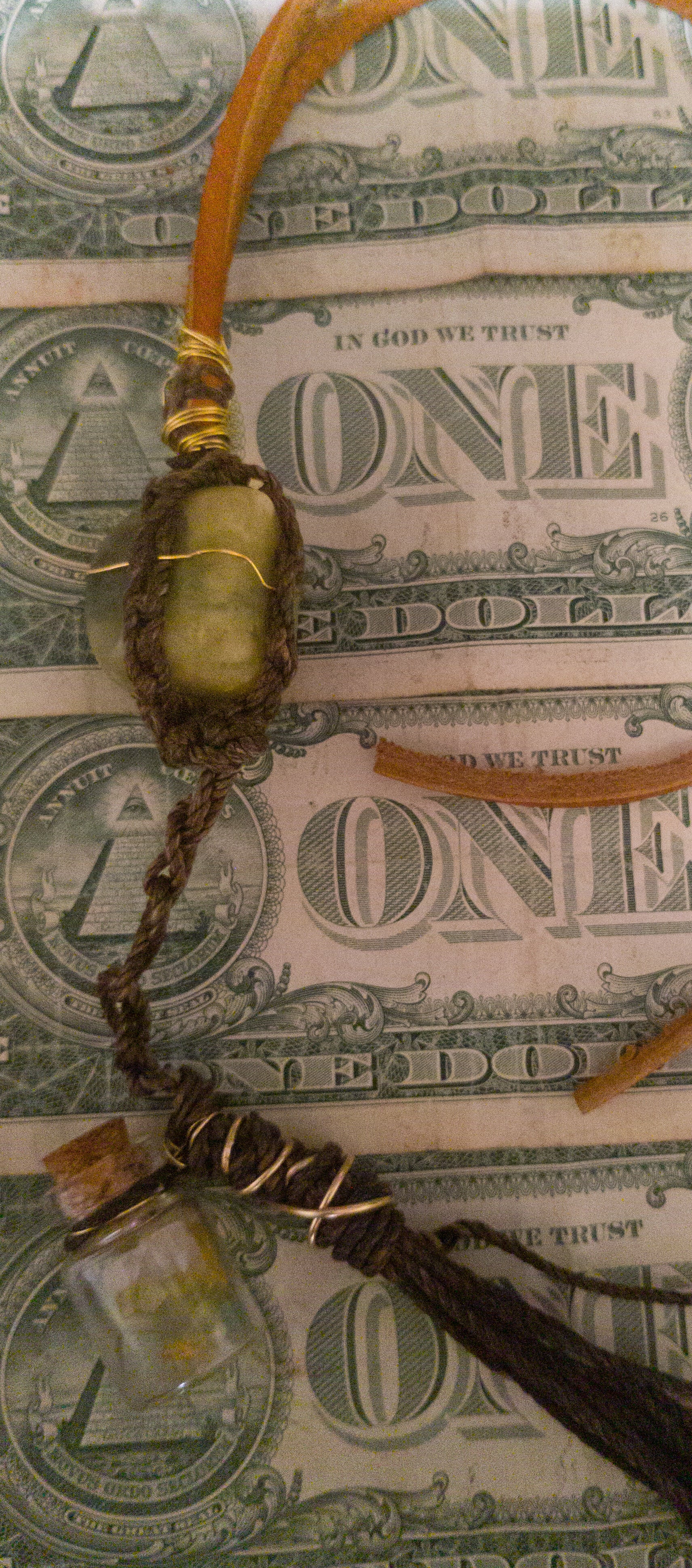 Vehicle charm with Jade as the main stone with brown thread and brass wire.